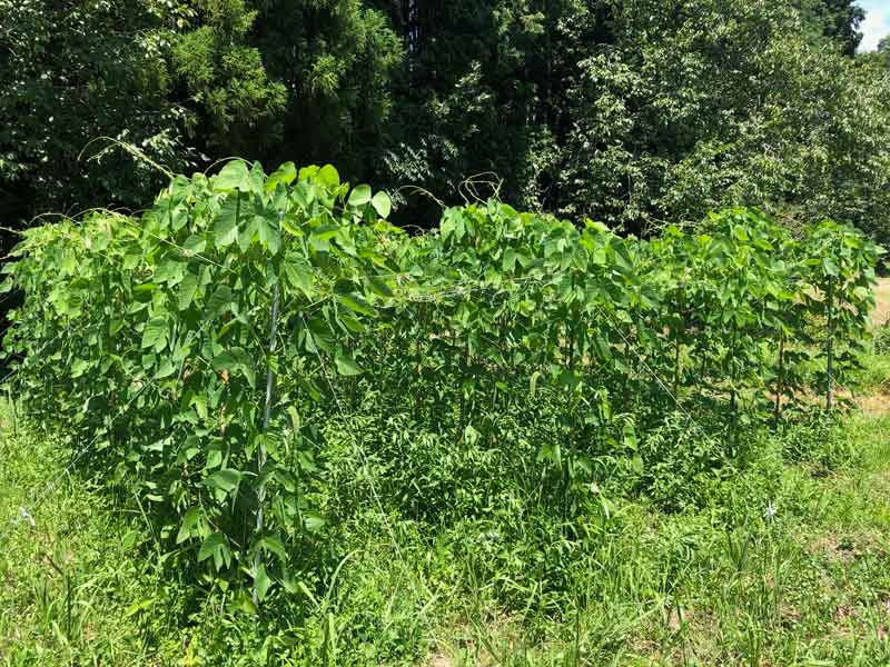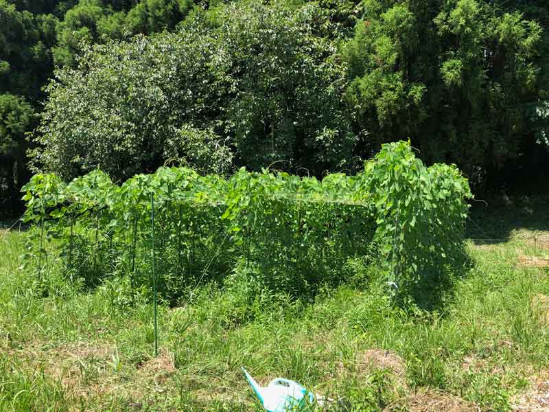 雑草の勢いがスゴイですが、ムクナマメも負けじと蔓を這わせて、這い上がってきています