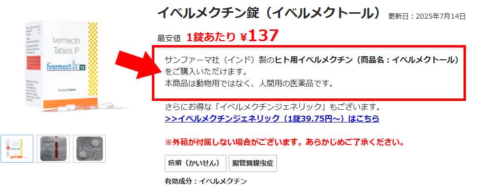 サンファーマ社(インド)製のヒト用イベルメクチン(商品名:イベルメクトール)をご購入いただけます。本商品は動物用ではなく、人間用の医薬品です。